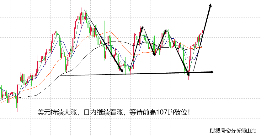 地缘局势还是非常影响暂时美元和贵金属的关系。美元在周三继续走单边上涨,一度冲高至106.5高点,下一个高点就要冲击前高107,按照山海预测的105.2看涨,先看107得失,破位之后后市可见109高点,这波上涨走势已经出现了一半的大涨空间,但是大家可以看到,黄金近期不但没有跌,反而在市场避险刺激下继续走高,实属有点无厘头。虽然这汇总情况算是合理,但不合情,上一波美元在107的时候,黄金在1820,正常情况下,地缘局势稳点,黄金避险情绪不高,这波黄金应该会走出大跌,所以,暂时黄金的价位非常虚高,美元周尾盘继续看涨,看黄金是否能持续被打压。