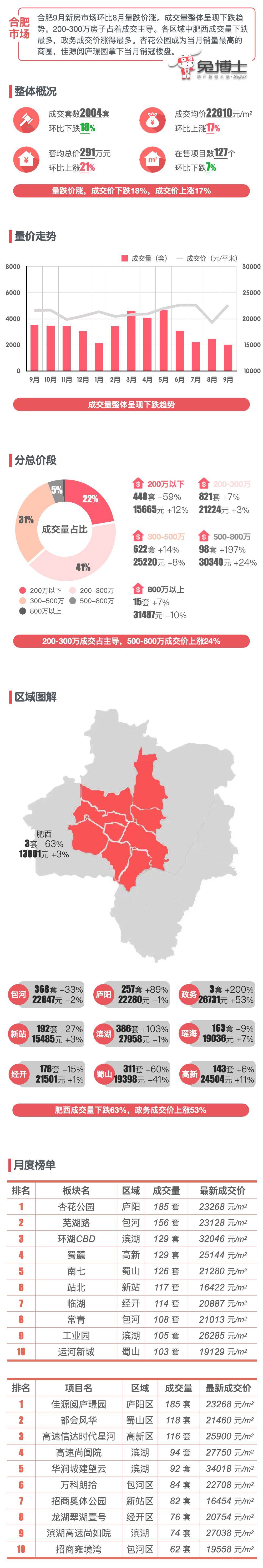 合肥9月新房市场环比8月量跌价涨。成交量整体呈现下跌趋势。200-300万房子占着成交主导。各区域中肥西成交量下跌最多,政务成交价涨得最多。杏花公园成为当月销量最高的商圈,佳源阅庐璟园拿下当月销冠楼盘。