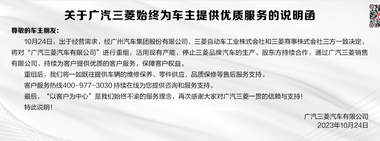 10月24日,三菱汽车公司官网也发布了关于中国业务结构变动通知。
