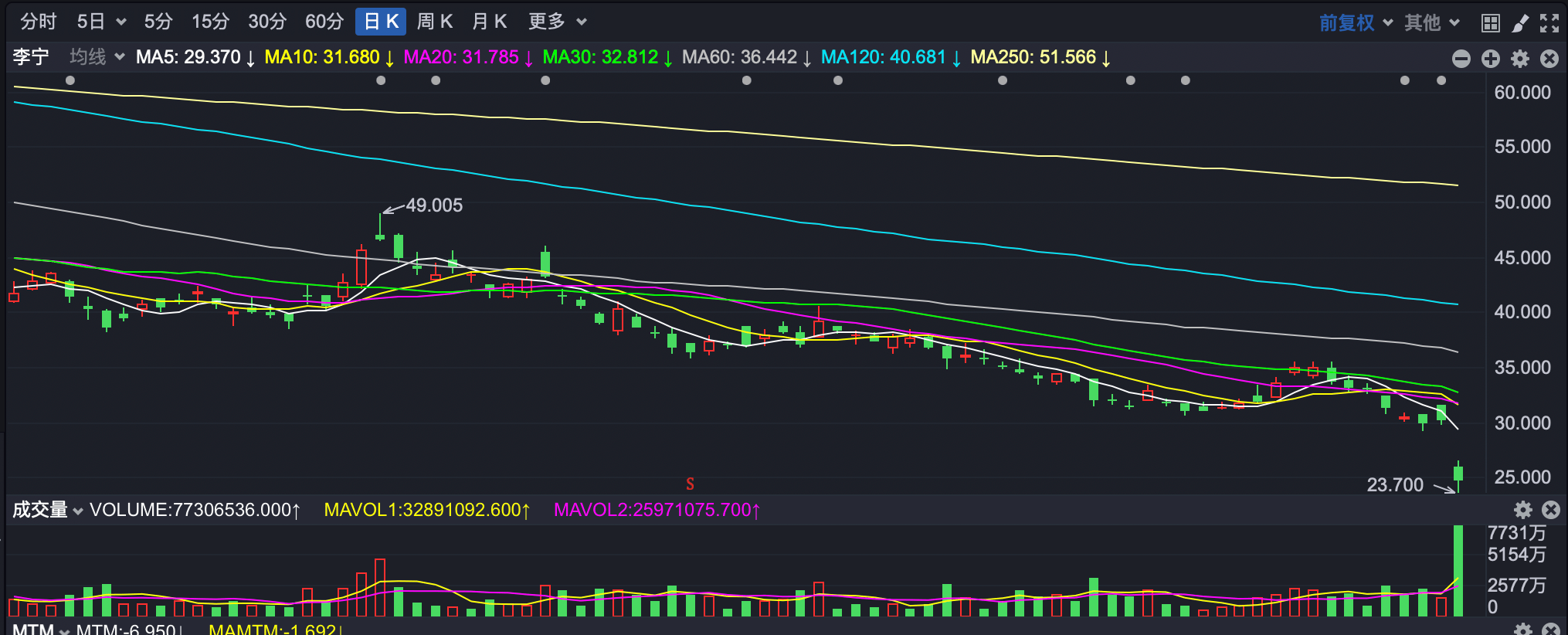 个股方面,李宁公布第三季度最新运营状况后,股价出现大幅下挫。盘中,李宁最大跌幅高达21%,截至发稿前报24.75港元,跌幅18%,创出2020年5月以来新低。