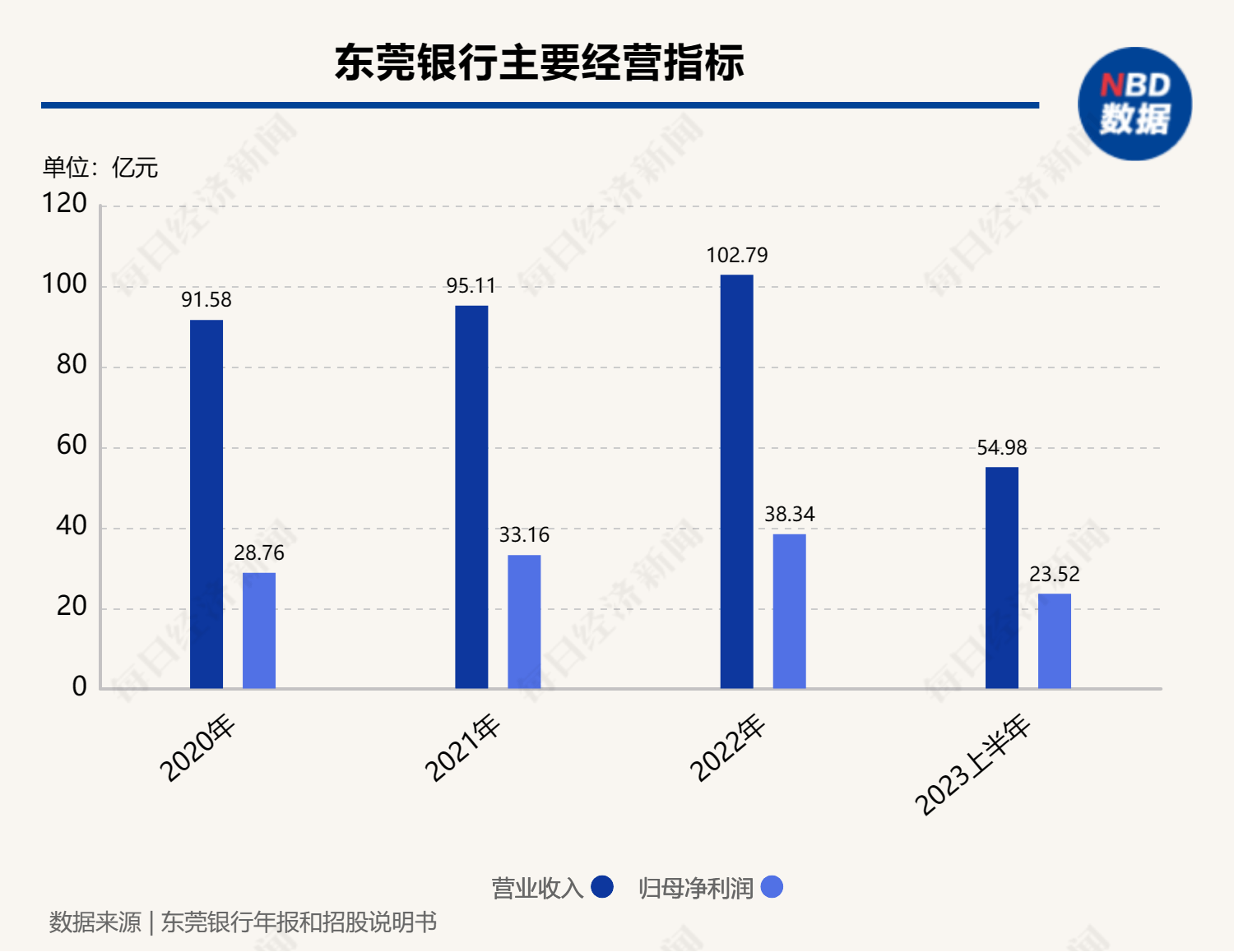 营收方面,今年前6个月,东莞银行实现营收54.98亿元,归母净利润23.52亿元。拉长时间线来看,2020—2022年,该行营收分别为91.58亿元、95.11亿元、102.79亿元;归母净利润分别为28.76亿元、33.16亿元、38.34亿元。