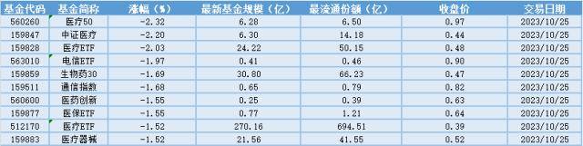 下跌方面,25日跌幅最大的是医疗50(560260)跌幅达到2.32%。剩余排名靠前的有中证医疗(159847)、医疗ETF(159828)、电信ETF(563010),跌幅分别为2.20%、2.03%、1.97%。从整体上看数量占比较多的为医疗ETF。