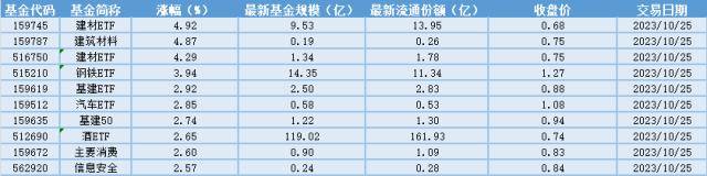 根据巨灵财经统计的数据显示,10月25日场内ETF基金中建材ETF(159745),涨幅4.92%,其余ETF涨幅均超过2.5%,排名靠前的建筑材料(159787)、建材ETF(516750)、钢铁ETF(515210),涨幅分别为4.87%、4.29%、3.94%。从整体上看数量占比较多的为建材ETF。