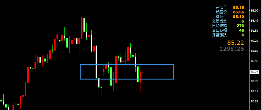原油回踩84.5附近多,防守83.8,看86上方,反抽初见86.8附近空,防守87.5,看85附近