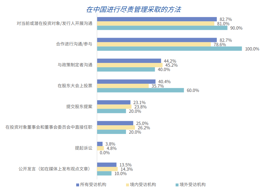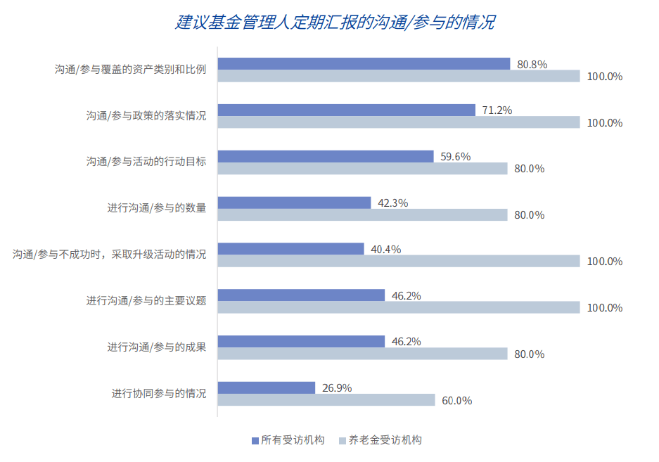 与其他类型的资产所有者相比,养老金对股东参与和尽责管理的关注和投入更为突出,对尽责管理政策的覆盖相对更为全面,要求基金管理人定期汇报的沟通/参与内容和范围也更加广泛,且所有的养老金受访机构都要求基金管理人对投资组合中的公司进行沟通/参与。