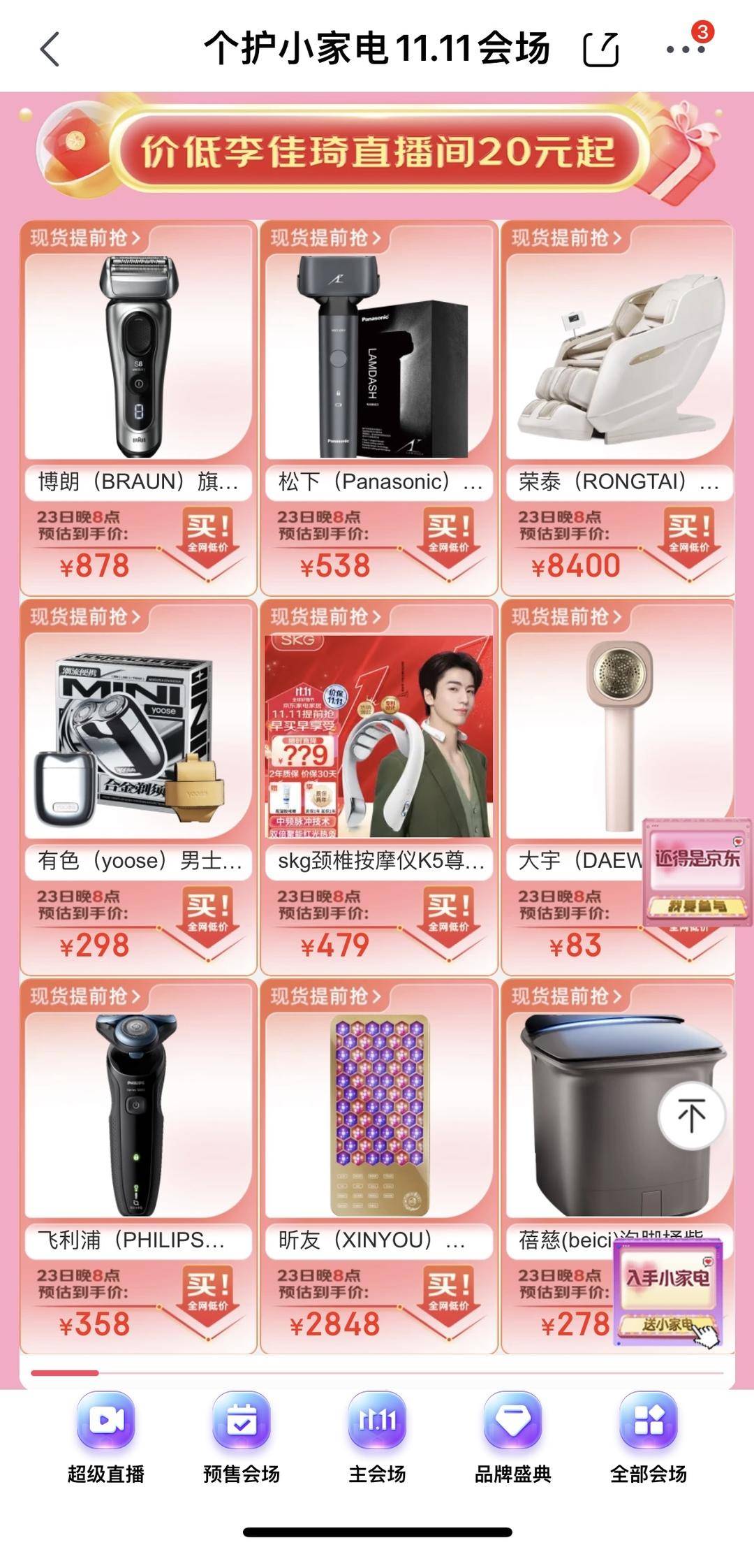 此外,在该直播间的个护家电频道,还显示“价低李佳琦直播间20元起”栏目,包括剃须刀、吹风机、按摩沙发等家电。截至发稿,该直播间观看量超300万。