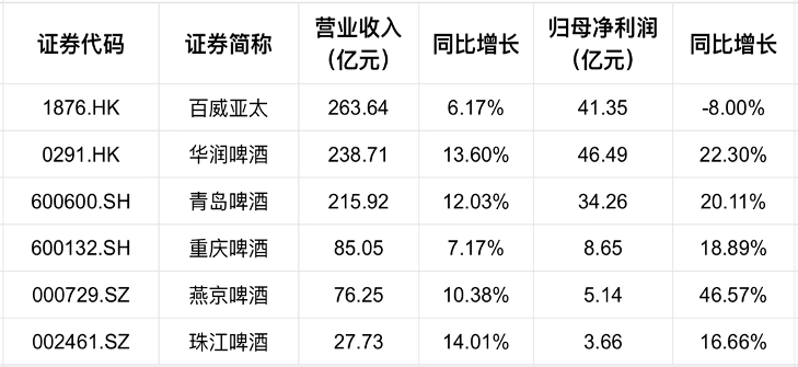 从上半年业绩数据来看,尽管该公司在上半年的营收、归母净利润增速实现了双位数增长,分别增长14.01%和16.66%,但与同行业上市公司百威亚太(1876.HK)、华润啤酒(0291.HK)、青岛啤酒(600600.SH)、重庆啤酒(600132.SH)、燕京啤酒(000729.SZ)5家头部企业相比,虽然营收增速保持最高,但珠江啤酒的营收规模和归母净利润增幅都处于较低水平,其中营收规模在6家企业中处于最低,归母净利润增速仅在百威亚太之上。