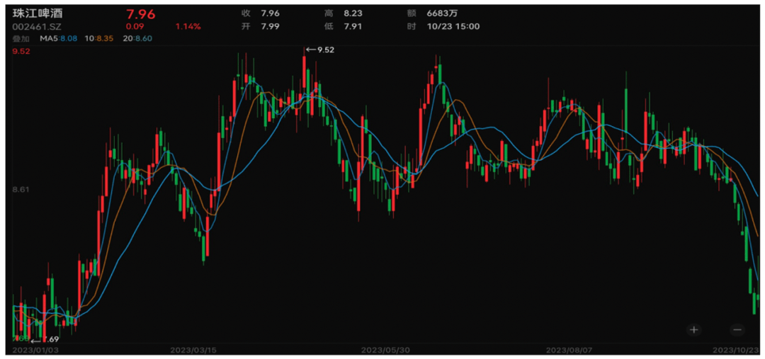 10月13日至10月20日,珠江啤酒股价连续6个交易日出现下跌。此后公司股价虽有回调,但10月24日仍触及今年以来股价新低,达7.66元/股