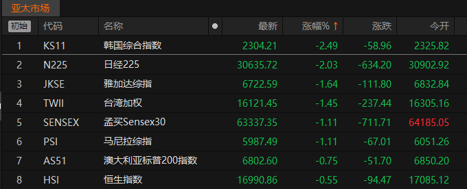 上证报中国证券网讯 据Choice金融终端数据,10月26日午间,亚太市场主要股指全线下跌。截至北京时间12时56分,韩国综合指数跌2.49%,报2304.21点;日经225指数跌2.03%,报30635.72点;澳大利亚标普200指数跌0.75%,报6802.60点。