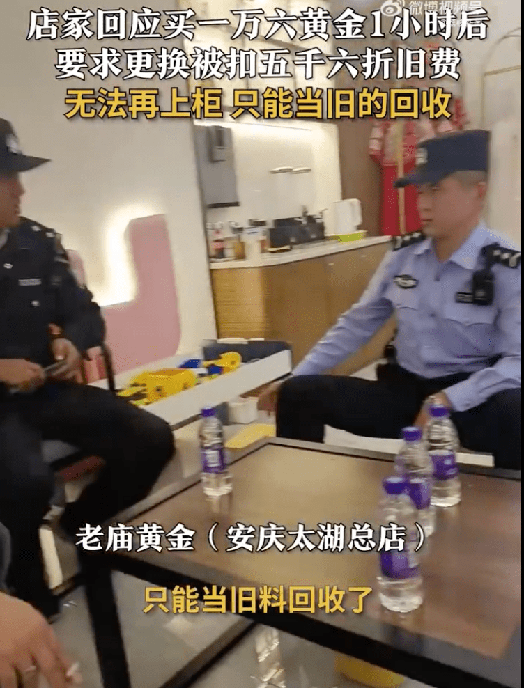 店家老庙黄金(安庆太湖总店)表示,该顾客买了两个手镯和一个套链,更换款式均要按回收来处理,收取35%的折旧费。最后,破例帮其免费更换,原本的首饰只能按照回收的来处理,不能再次放到柜子里进行售卖。