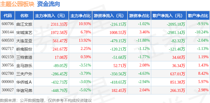从资金流向上来看,当日主题公园板块主力资金净流入3847.12万元,游资资金净流出392.68万元,散户资金净流出3454.43万元。主题公园板块个股资金流向见下表: