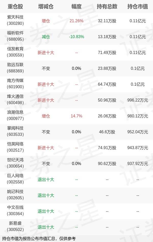 证券之星消息,10月25日财通基金金梓才旗下基金公布2023年三季报,综合其旗下各基金报告,传媒行业板块个股更受其关注,与上季度相比,紫天科技等被增持,南方传媒等新入十大重仓;游戏行业板块则遭到减持,巨人网络,姚记科技,中文在线等退出十大重仓;目前其旗下基金综合持仓排名前三个股为紫天科技、福昕软件、佳发教育。