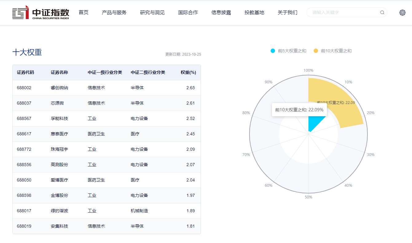 数据显示,截至2023年10月25日,该指数前十大权重股包括睿创微纳、芯源微、孚能科技、惠泰医疗、珠海冠宇等,前十大权重股合计占比约为22.09%。(数据来源:中证指数公司,指数成份股不代表个股推荐)