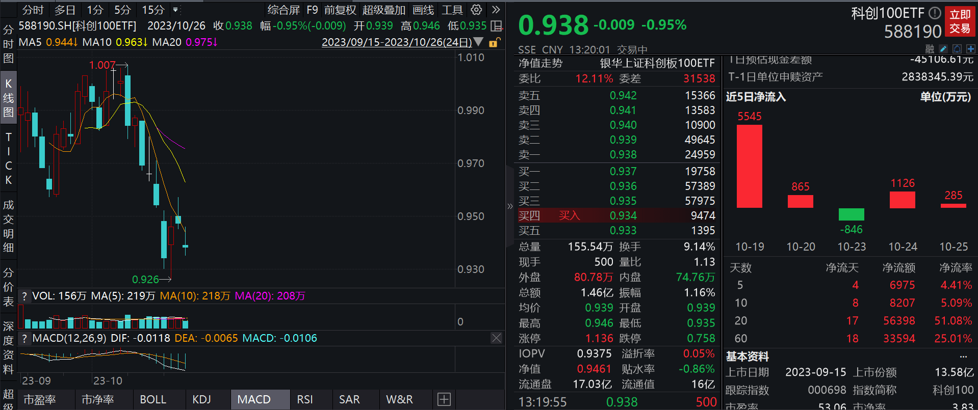 截至2023年10月26日13:20,科创100ETF(588190)午后延续回调0.95%,报0.938元,委比12.11%,盘中溢价0.05%,换手率达9.14%,市场交投活跃。