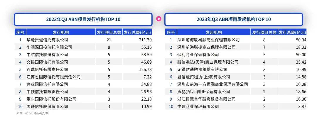 在ABN方面,根据Wind数据显示,从发行机构来看,2023年第三季度华能贵诚信托有限公司以发行21单,发行规模人民币211.39亿元,成为ABN发行机构发行数量及发行金额榜首,金额占前10名约35%。从发起机构来看,深圳前海联易融商业保理有限公司则以发行8个项目,发行规模人民币50.94亿元,成为ABN发起机构发行数量及发行金额top1,金额占前10名约23%。