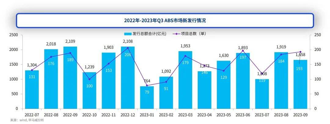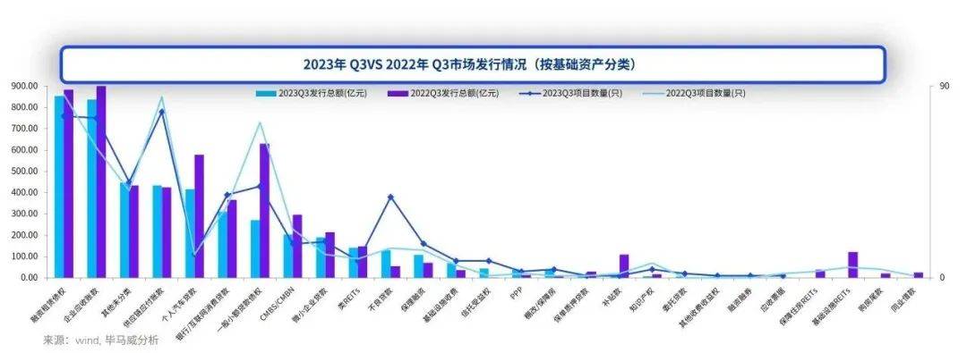 根据Wind数据显示,截至2023年9月30日,2023年第三季度资产证券化市场共发行496单产品,环比二季度发行数量上涨5%,发行总额则环比小幅下降4%。相比2022年第三季度,发行数量持平,发行规模同比下降16%,发行金额为人民币4,584亿元。