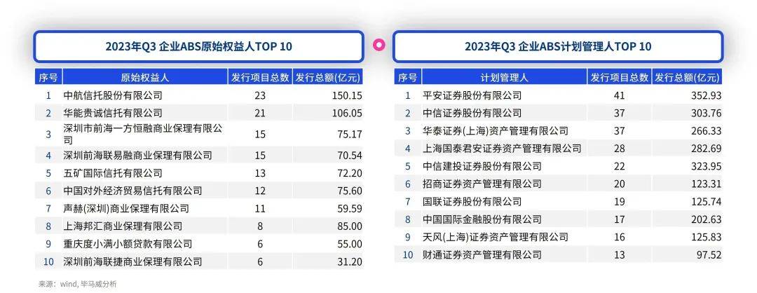 在企业ABS方面,根据Wind数据显示,按照项目总数口径统计,2023年第三季度中航信托股份有限公司共发行23个项目、发行总额人民币150.15亿元,位列企业ABS原始权益人项目数量和发行金额第一。关于企业ABS计划管理人,平安证券发行41个项目,发行规模达到人民币352.93亿元位居计划管理人之最,金额占前10计划管理人约16%。
