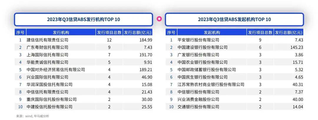 2023年第三季度,信贷ABS发行机构从发行规模来看 ,上海国际信托有限公司为发行规模榜首,金额为人民币191.70亿元。从发行数量来看,建信信托有限责任公司发行12个项目,成为信贷ABS发行机构项目数量第一。关于发起机构排名,中国建设银行股份有限公司以发行6个项目,金额总额人民币145.23亿元,占据银行机构项目发行总额之首。平安银行股份有限公司则为上榜发起机构中发行项目总数最多的银行机构,共发行9个项目。