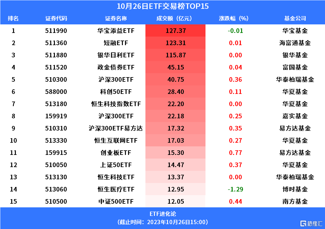 今日交易榜前三为银华日利ETF、海富通基金短融ETF和华宝添益ETF,连续两日三只ETF成交额均破百亿。