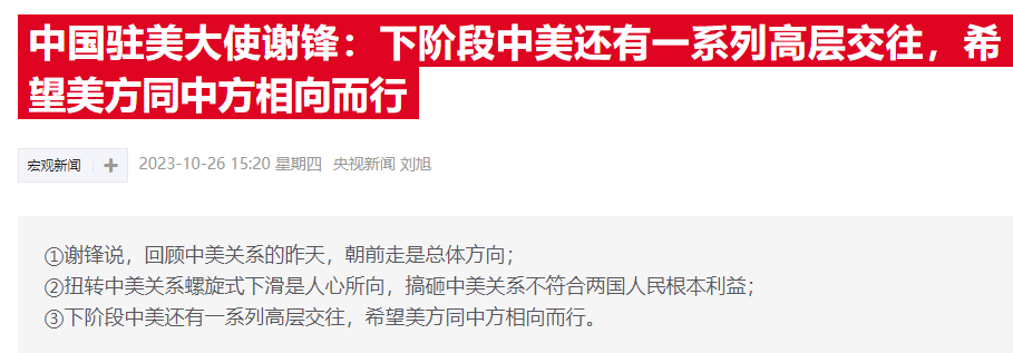 根据财联社报道,当地时间10月24日,美中关系全国委员会在纽约举行2023年度颁奖晚宴,中国驻美大使谢锋应邀出席,现场宣读习近平主席贺信并致辞。美中关系全国委员会向美前国务卿基辛格颁奖,表彰其为促进中美关系发展作出的卓越贡献。美前国务卿基辛格、前财长盖特纳、前运输部长赵小兰、美中关系全国委员会会长欧伦斯等近400人参加。