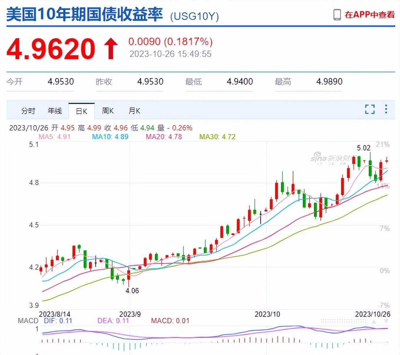 昨晚,美国公布的9月新屋销售总数年化75.9万户,较前月上升12.3%,预期68万户,前值67.5万户。美国9月新屋销售数据大超预期,再加上今晚美国将公布三季度GDP数据,市场担心可能会继续大超预期,昨晚美债收益率再次飙升突破4.95%,美元指数大涨。