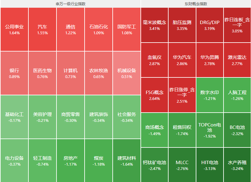 分行业来看,公用事业、汽车、通信、石油石化、国防军工等行业领涨,建筑材料、煤炭、房地产等行业领跌。