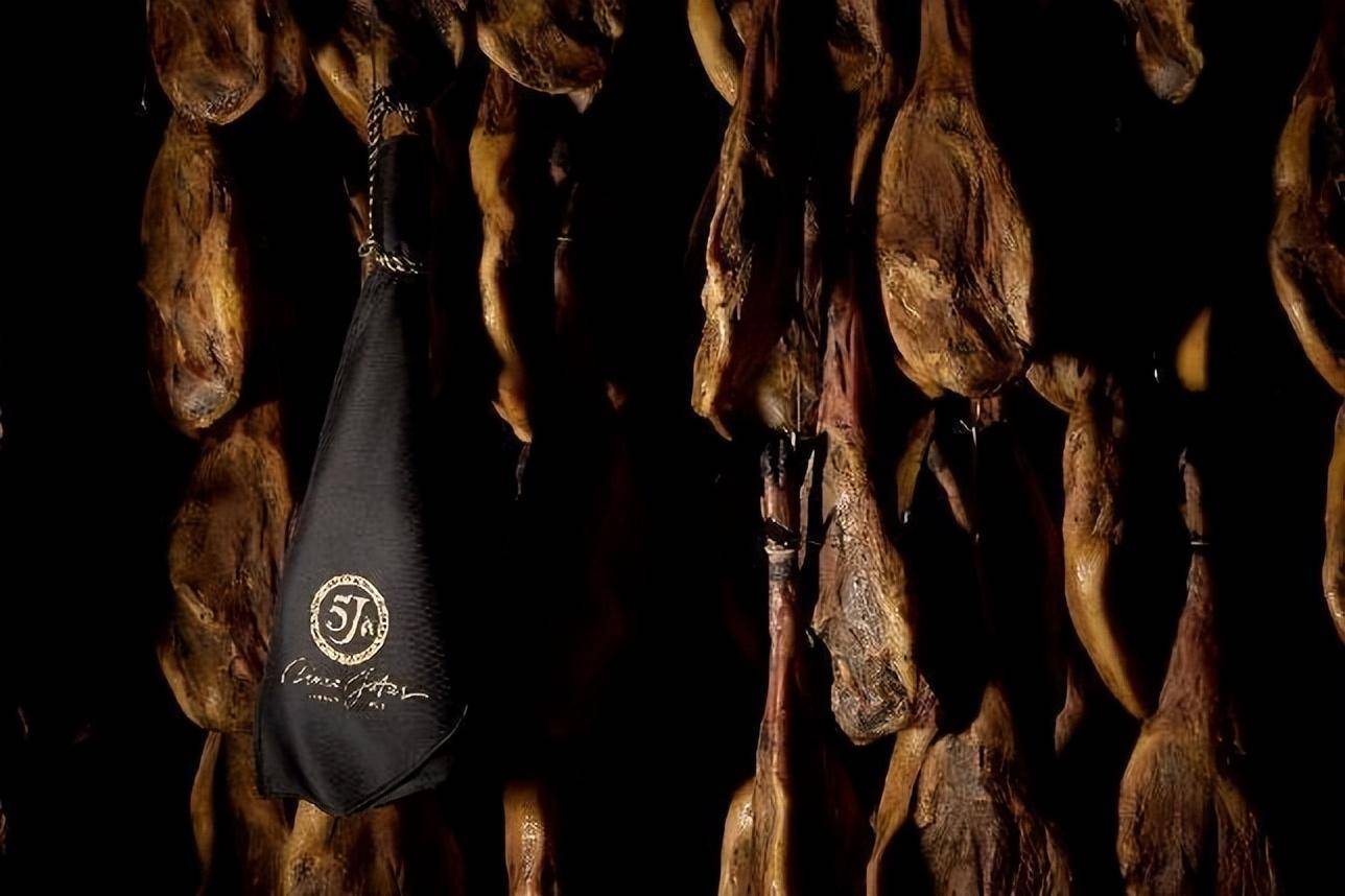 拥有143年悠久历史、与鱼子酱里雄鱼子一样珍贵、选用橡果喂养100%纯种伊比利亚猪、超越了西班牙国家法定等级黑标的质量标准的5J (Cinco Jotas)西班牙黑标火腿 。