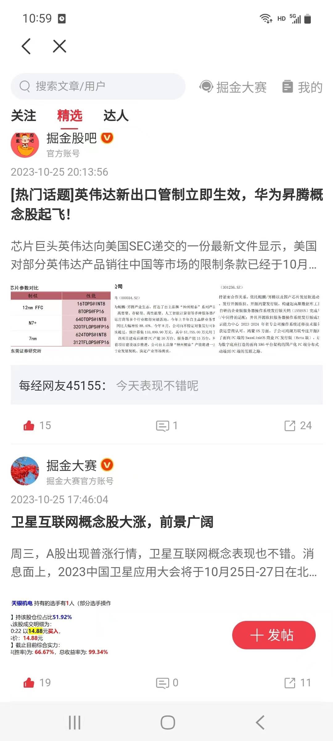 从10月25日盘后,从参赛以来胜率≥60%并且多期比赛累计收益率≥30%的精选高手持仓动向来看,有优秀选手在10月22日14.88元买入卫星互联网概念股天银机电,目前这位选手依然持有该股,该股今天20CM,确实牛。