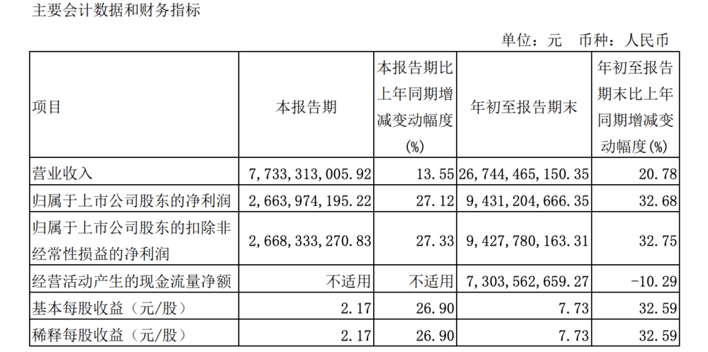 第三季度实现营收77.33亿元,同比增长13.55%,净利润为26.64亿元,同比增长27.12%。