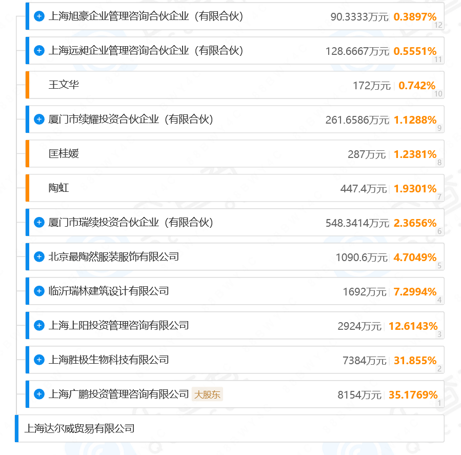达尔威公司大股东为上海广鹏投资管理有限公司,持股占比达到35%;此外,上海胜极生物科技有限公司(以下简称上海胜极)持股33%。上海广鹏投资管理有限公司法定代表人为张淑琴(张庭本名),由领扬科技有限公司100%控股;上海胜极的法人代表也为张淑琴,由展麗(香港)有限公司100%控股。