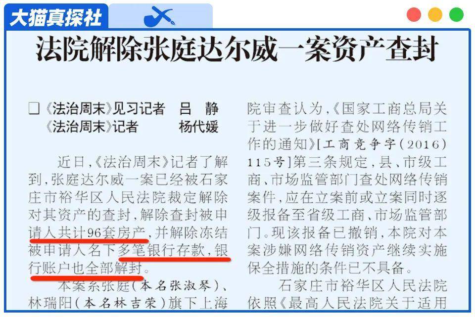 根据媒体报道,张庭旗下的达尔威涉传销一案的资产查封,已经被石家庄裕华区法院裁定解除,而解封的资产包括96套房产和多笔银行存款。