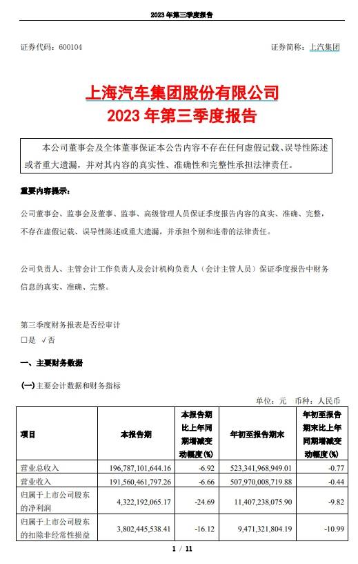 前三季度,上汽集团营业总收入5233.42亿元,同比降0.77%;归属于上市公司股东的净利润114.07亿元,同比降9.82%。