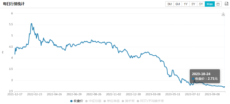 截至10月24日,建信中关村REIT收盘报2.71元/份,已跌破发行价,且较年初的4.08元/份下跌33.58%,较上市以来的最高点5.55元/份下跌51.17%。