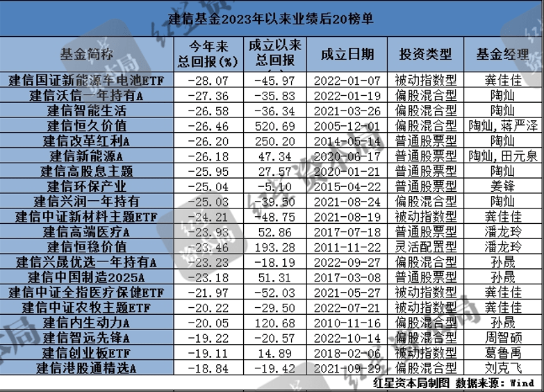 业绩后20榜单中,龚佳佳共有4只基金上榜,建信中证新材料主题ETF、建信中证全指医疗保健设备与服务ETF、建信中证农牧主题ETF的年内收益率也都跌超20%;陶灿在管的7只基金全数上榜,近一年收益率均跌超30%;孙晟也有3只基金上榜,其中建信内生动力A成立以来收益率高达120.68%,但孙晟仅任职两年,任职回报跌至-41.92%。