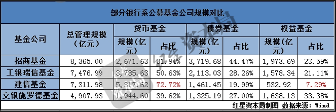 尽管银行系公募在发行货基和债基上有渠道优势,但建信基金的权益基金规模落后于同类。其总规模排在招商基金、工银瑞信基金之后,但货基规模远高于这两家基金公司。建信基金的权益基金占比也低于总规模排在其之后的交银施罗德基金。