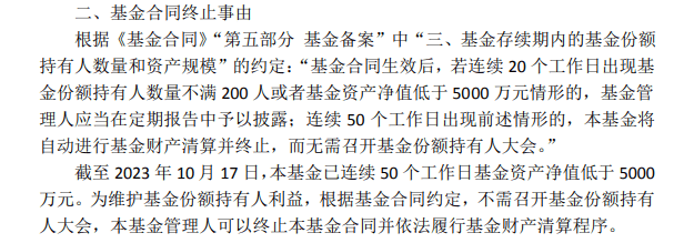 以9月27日发布清盘公告的建信鑫瑞回报为例,公告显示,截至9月26日,该基金已连续60个工作日出现基金资产净值低于5000万元的情形;建信中证饮料主题ETF是最新一只清盘的基金,截至10月17日,该基金已连续50个工作日基金资产净值低于5000万元。