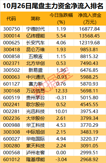 从个股看,有30股主力资金净流入超亿元,汽车、华为产业最受资金追捧。