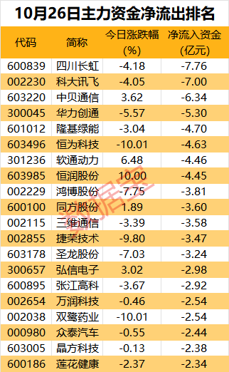 算力概念四川长虹净流出超7亿元;该股10月以来累计上涨超40%。公司表示,间接持有华鲲振宇2.42%的股权。AI概念科大讯飞净流出资金也超7亿元。
