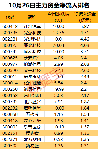 江淮汽车净流入金额最高,为5.87亿元;该股连续两日涨停。汽车产业多股资金流入靠前,光弘科技净流入4.71亿元,长安汽车、北汽蓝谷等净流入超亿元。