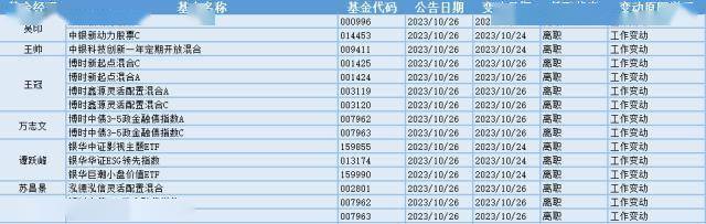 根据巨灵统计的数据显示,近30天(9.26-10.26)共有280只基金产品的基金经理发生离职变动。其中今天(10.26)有15只基金产品发布基金经理离职公告,从变动原因上来看,有7位基金经理是由于工作变动而从管理的15只基金产品中离职的。