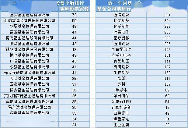 近一个月(9月26日-10月26日),嘉实基金参与公司调研的数量最多,共调研72家上市公司,然后调研较为活跃的还有汇添富基金、华夏基金、富国基金,分别调研50家、48家、47家上市公司;从调研行业上来看,基金公司对通信设备行业的上市公司调研次数最多,共有321次,其次是化学制品行业,基金公司调研了304次。