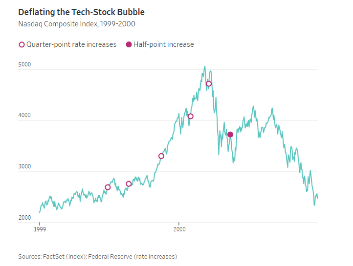 但从1999年6月到2000年5月,美联储确实六次加息,最后一次上调了0.5个百分点至6.5%。当时,泡沫已经被戳破。到2003年,利率降至1%,为近20年的低利率奠定了基础。