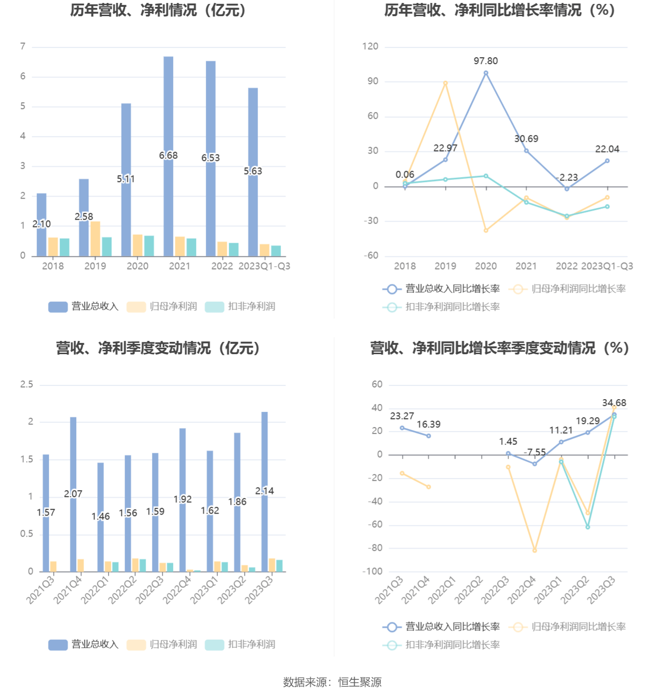 根据三季报,公司第三季度实现营业总收入2.14亿元,同比增长34.68%,环比增长15.14%;归母净利润1756.8万元,同比增长40.97%,环比增长96.29%;扣非净利润1551.27万元,同比增长32.82%,环比增长141.37%。