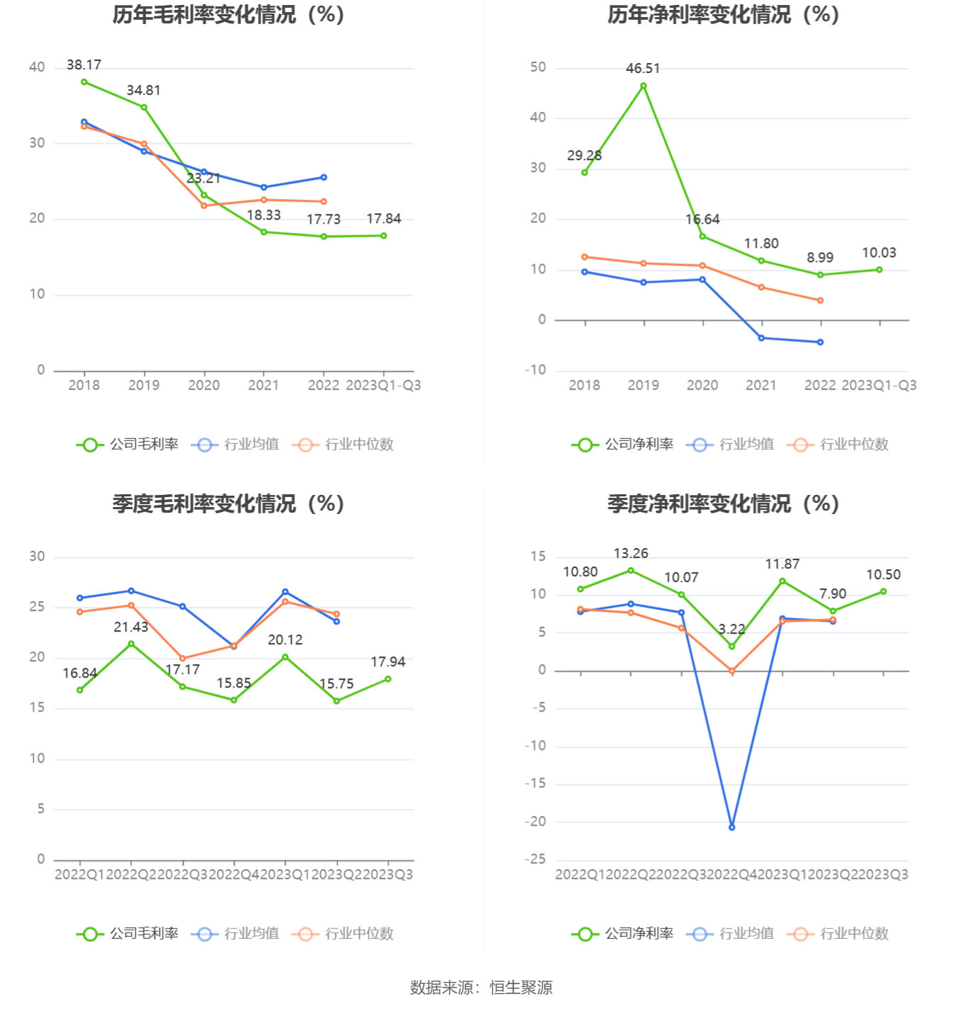 2023年前三季度,公司毛利率为17.84%,同比下降0.67个百分点;净利率为10.03%,较上年同期下降1.35个百分点。从单季度指标来看,2023年第三季度公司毛利率为17.94%,同比上升0.77个百分点,环比上升2.19个百分点;净利率为10.50%,较上年同期上升0.43个百分点,较上一季度上升2.60个百分点。