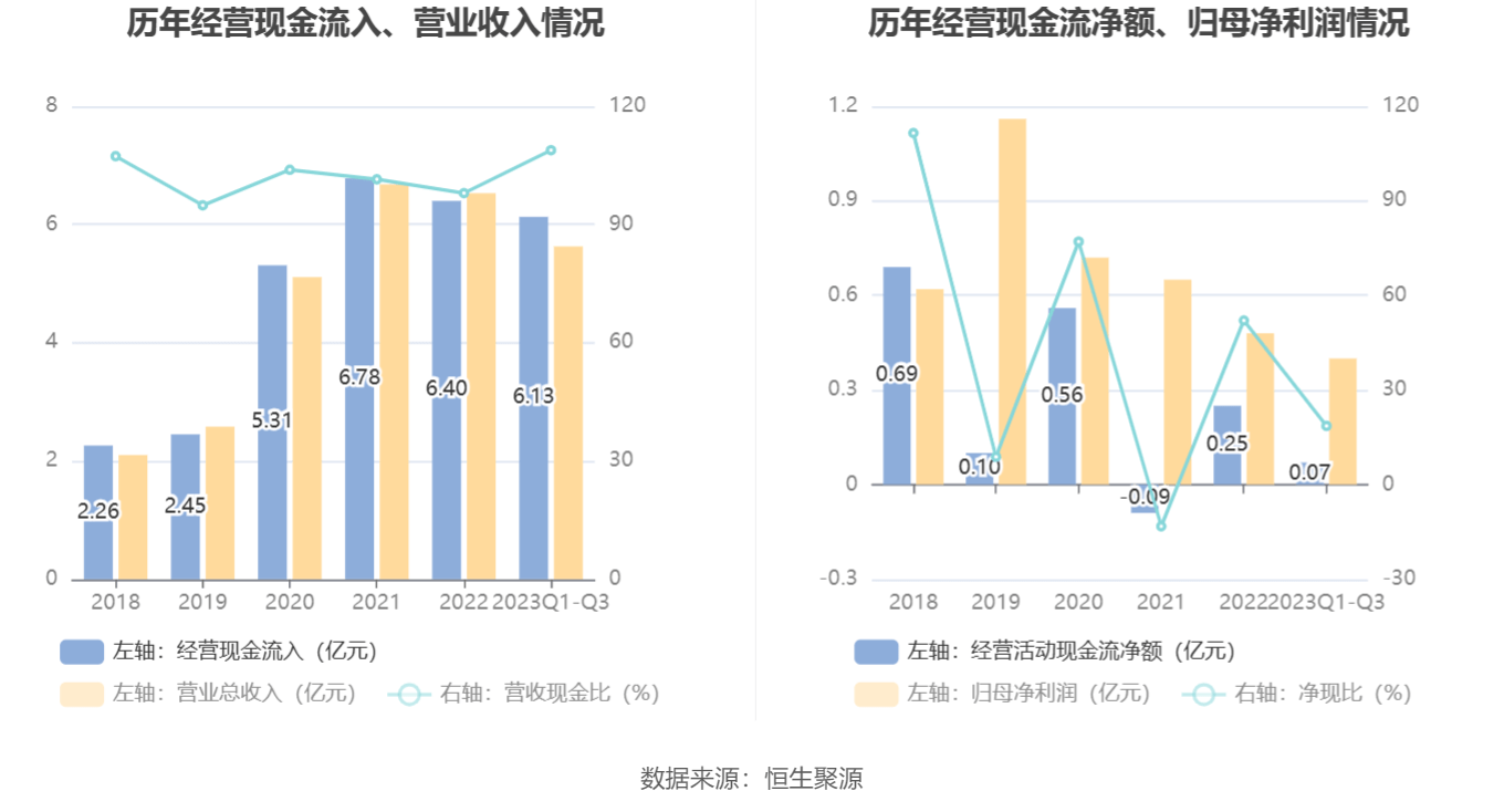 2023年前三季度,公司营业收入现金比为108.87%,净现比为18.61%。