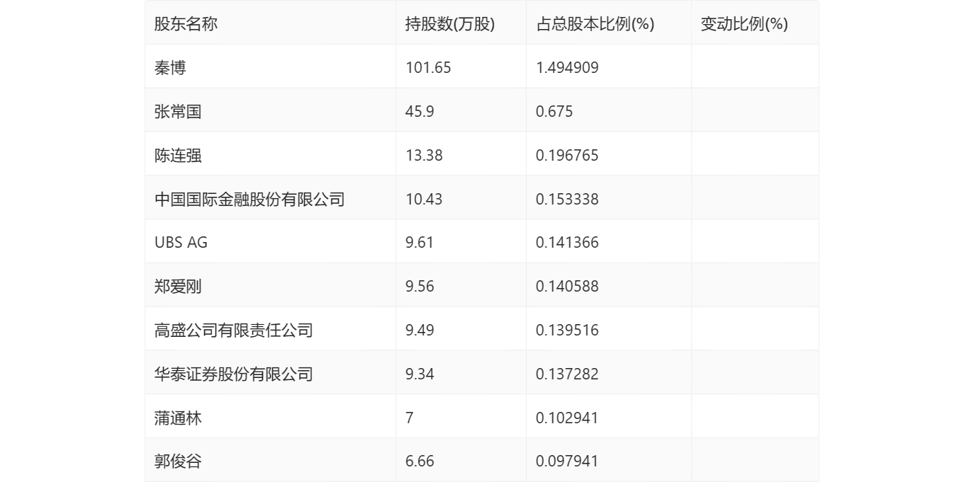 三季报显示,2023年三季度末公司十大流通股东中,新进股东为张常国、陈连强、中国国际金融股份有限公司、UBS AG、郑爱刚、高盛公司有限责任公司、华泰证券股份有限公司、蒲通林、郭俊谷。在具体持股比例上,秦博持股有所上升。