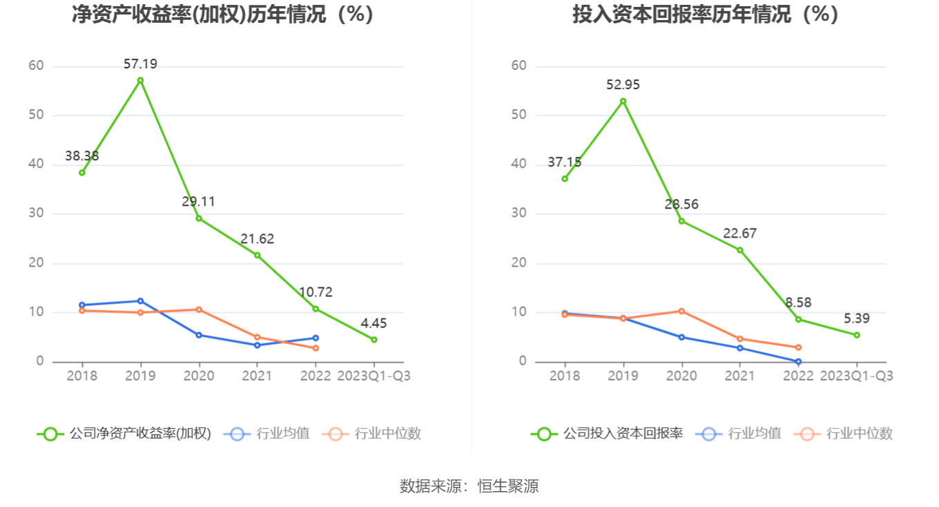数据显示,2023年前三季度公司加权平均净资产收益率为4.45%,较上年同期下降8.02个百分点;公司2023年前三季度投入资本回报率为5.39%,较上年同期下降7.61个百分点。