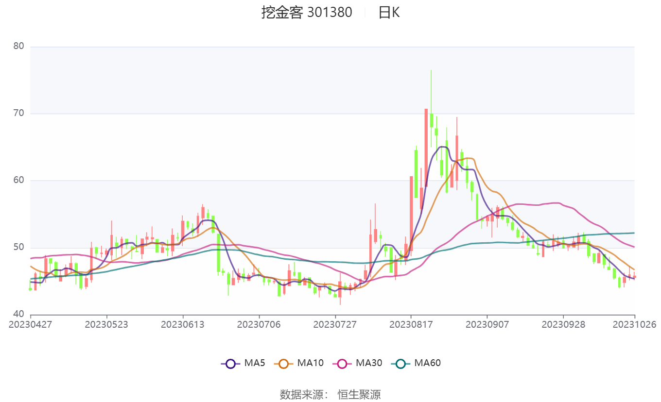 以10月26日收盘价计算,挖金客目前市盈率(TTM)约为71.7倍,市净率(LF)约为4.2倍,市销率(TTM)约为4.12倍。