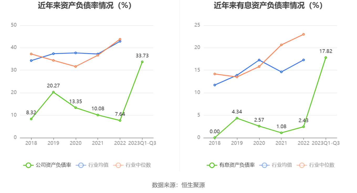 在偿债能力方面,公司2023年三季度末资产负债率为33.73%,相比上年末上升26.09个百分点;有息资产负债率为17.82%,相比上年末上升15.39个百分点。
