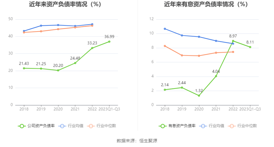 在偿债能力方面,公司2023年三季度末资产负债率为36.99%,相比上年末上升3.76个百分点;有息资产负债率为8.11%,相比上年末下降0.86个百分点。